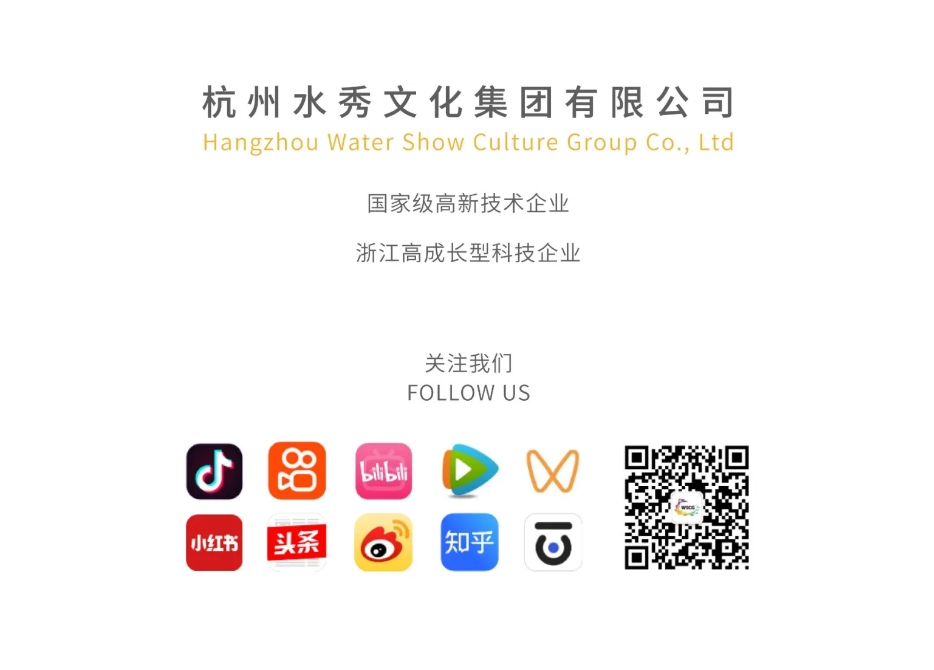 杭州水秀文化集团创建于1989年,是国家高新技术企业、浙江高新技术企业研发中心。总部位于杭州紫金港科技城。作为中国水景行业的特级企业和国家行业技术规范的参与者,34年来专注于大型光影水秀项目的设计、生产、施工和售后服务。公司项目以原创艺术作品为主要载体,集真实表演艺术和数字成像技术、激光投影和人工智能技术于一体。国内多处地标获得国家质量工程一等奖和行业杰出贡献奖。积极参与“一带一路”建设,多次代表中国水秀行业在世界舞台为国家赢得重大荣誉。
