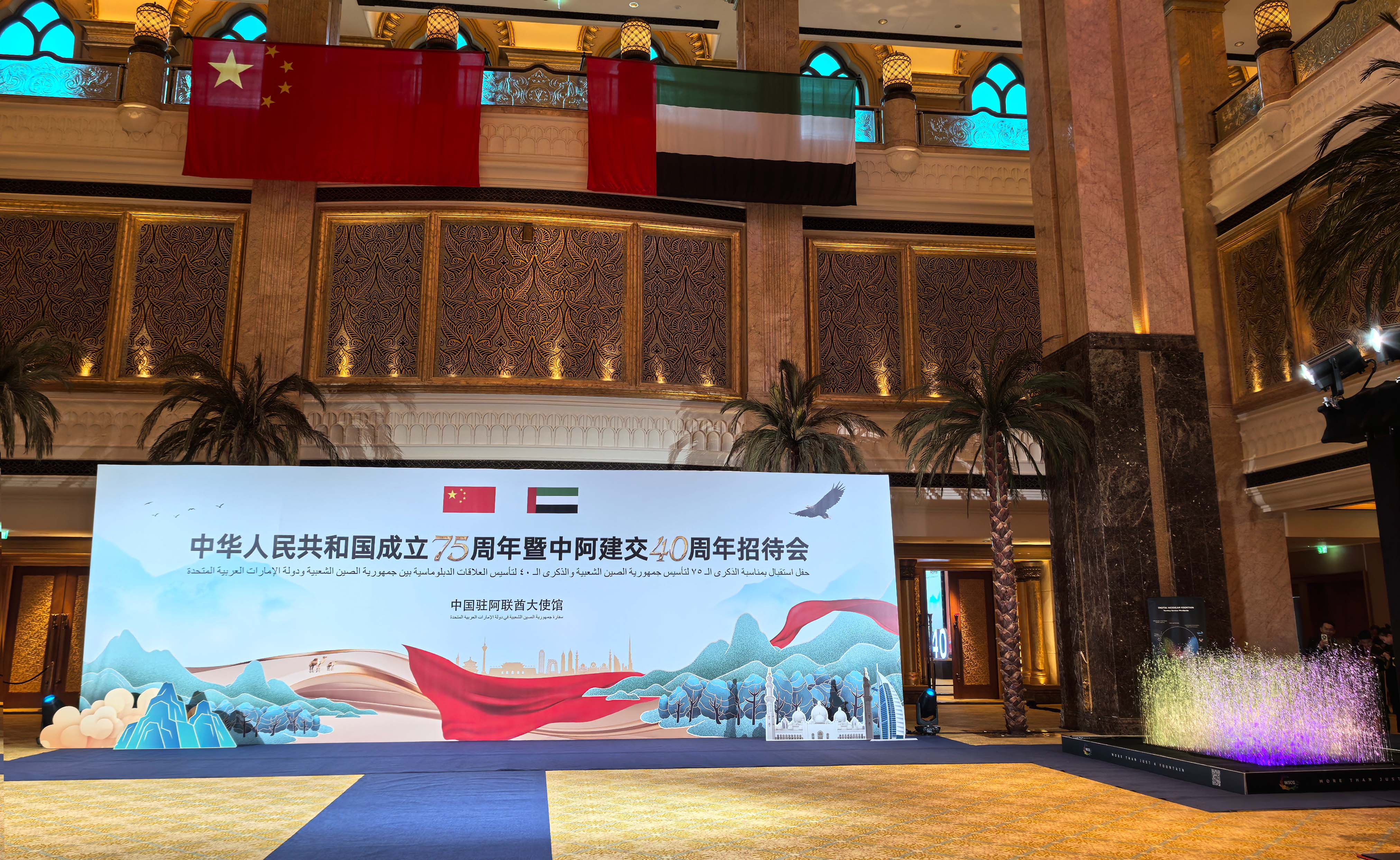 金秋10月,庆祝中华人民共和国成立75周年暨中阿两国建交40周年招待会在阿联酋阿布扎比酋长国宫殿酒店隆重举办,水秀文化集团作为行业代表出席,并为宾客们献上了一份独特的文化科技礼赞。