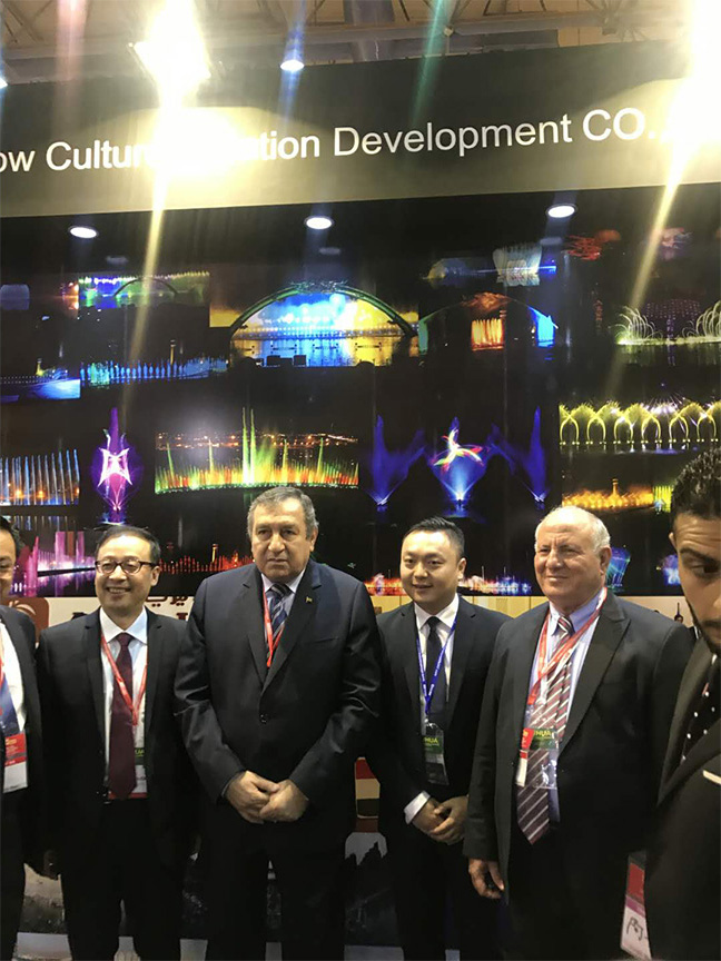 在开幕式当天,埃及前总理/中国政府一带一路智库专家/沙拉夫可持续发展基金会主席伊萨姆·沙拉夫先生以及中国驻埃及大使馆经济商务参赞韩兵先生等一行特别莅临水秀文化展台,表示对我司在埃及大开罗地区开建的Cleopatra Mall灯光水秀项目高度重视并且寄予厚望。