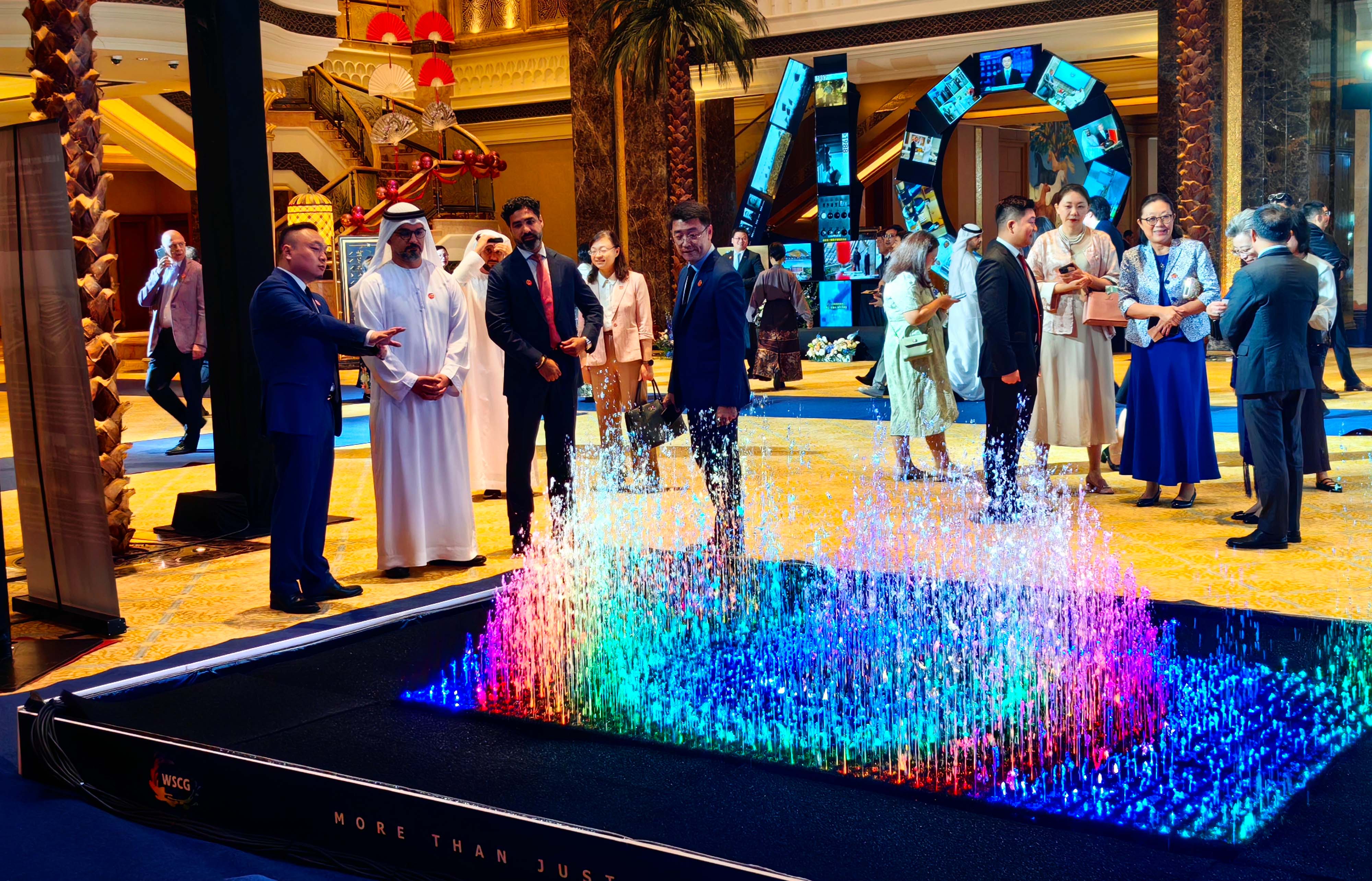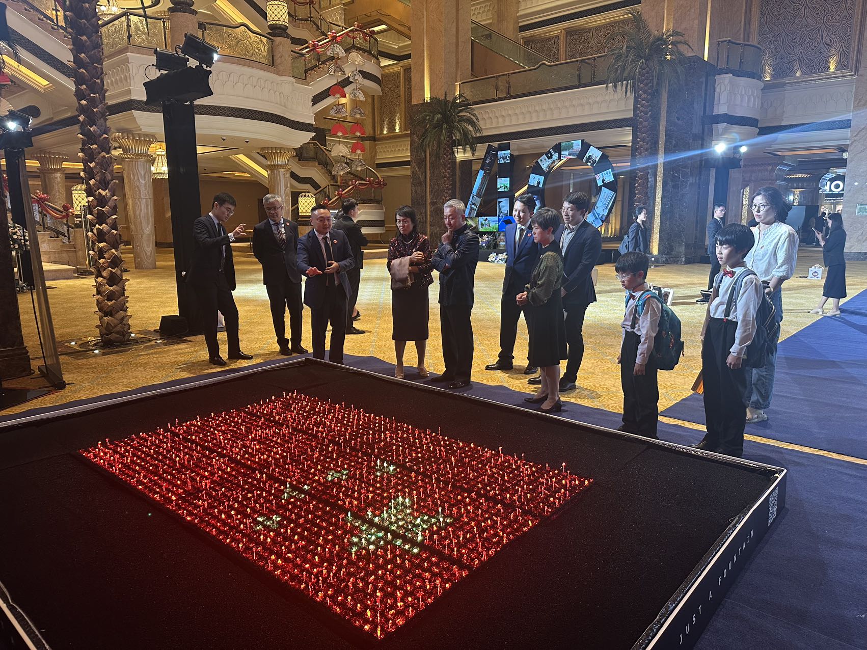 招待会入口处的亮点,是由水秀文化集团自主研发的模块化数字喷泉。精巧设计、智能操控,以及蕴含的文化深意瞬间吸引了全场目光。水利万物而不争,中阿两国的长期友好合作亦如此,上善若水,悄然润泽。这款喷泉,是水秀文化集团“文化+科技”理念的生动诠释,也是公司领先专利技术的结晶,中国智造在国际舞台上华丽亮相,彰显中国企业在科技创新领域的卓越与自信,为国际合作伙伴提供了更高品质的服务体验。