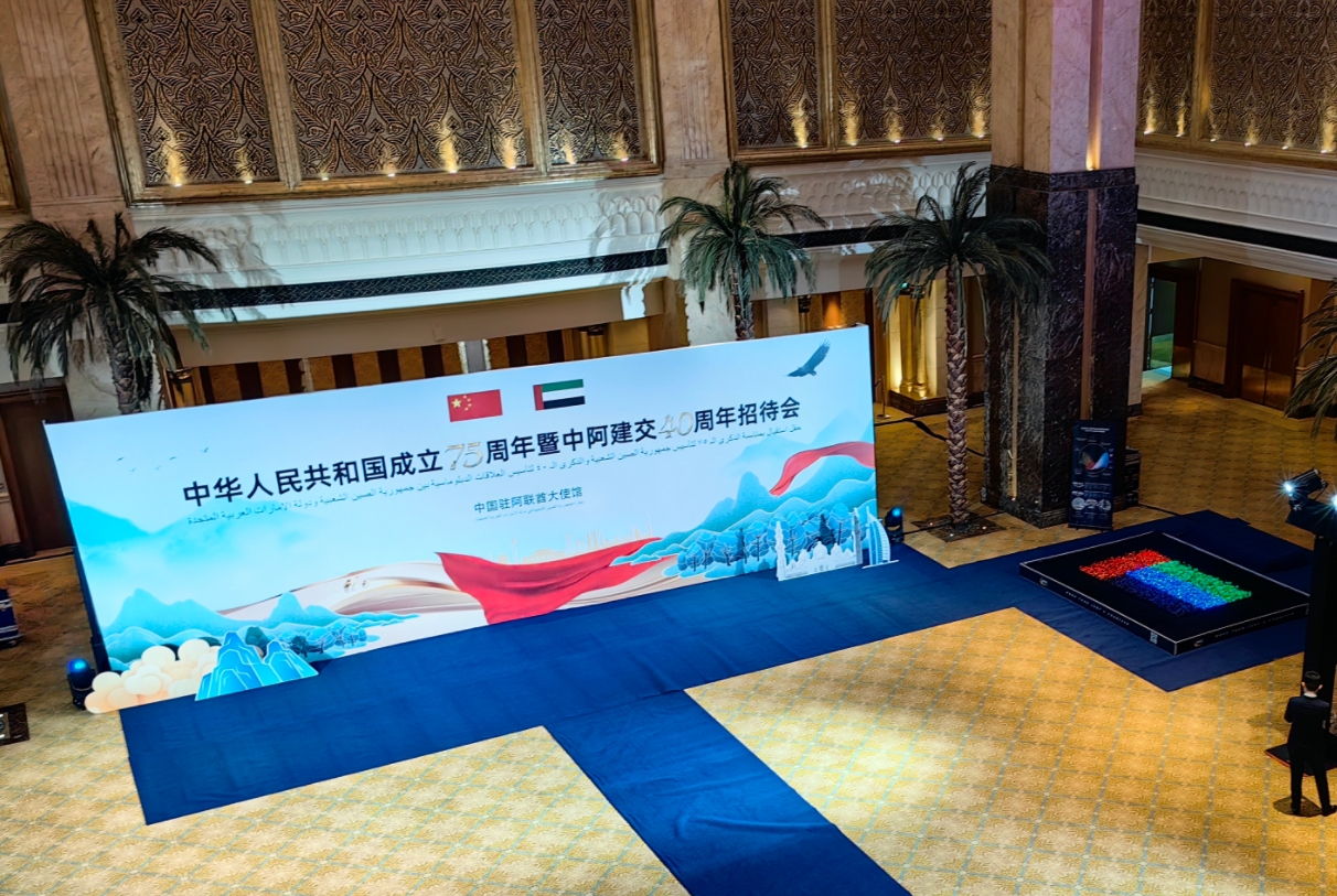 金秋10月,庆祝中华人民共和国成立75周年暨中阿两国建交40周年招待会在阿联酋阿布扎比酋长国宫殿酒店隆重举办,水秀文化集团作为行业代表出席,并为宾客们献上了一份独特的文化科技礼赞。